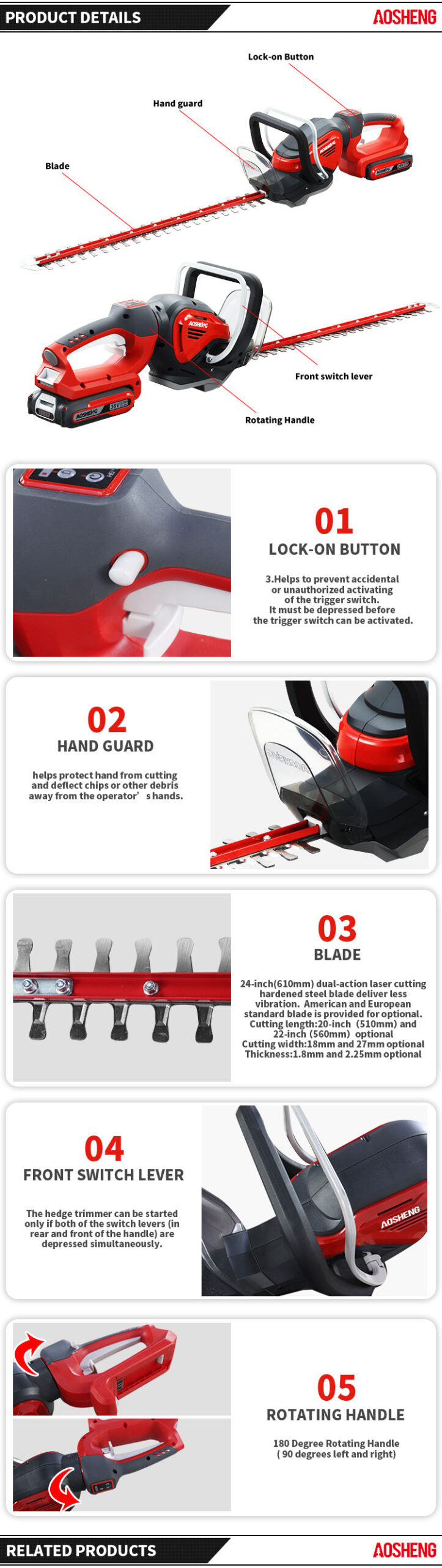 - Wide Reach – 21-inch blade trims large hedges quickly and cleanly.